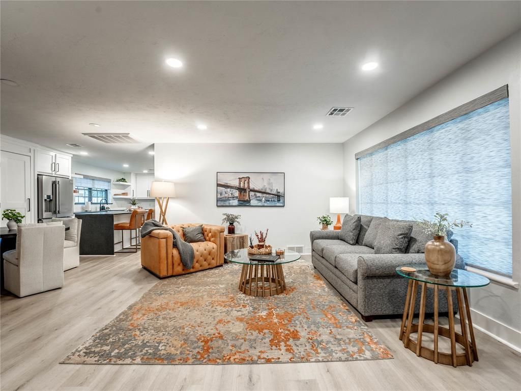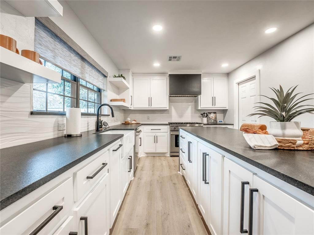 Welcome to this beautifully reimagined Nichols Hills residence, where timeless charm meets modern luxury. Ideally located near top dining, shopping, and entertainment, this renovated home blends classic architecture with contemporary comfort. The inviting exterior features coordinated river rock and concrete hardscape. Inside, an open layout flows seamlessly with new luxury vinyl wood-look flooring. The spacious living room offers abundant natural light through an oversized picture window. The stunning kitchen is the centerpiece, featuring an oversized island with seating, leather-finished granite waterfall edges, shaker-style soft-close cabinetry, a farmhouse sink, stainless-steel appliances, and a generous pantry. A built-in buffet with wine display off the dining room enhances entertaining. A cozy bonus room with fireplace and added HVAC venting provides a flexible retreat for relaxing or working. The home includes three comfortable bedrooms, including a primary suite with two closets. Both bathrooms have been fully redesigned with updated fixtures, accent walls, geometric tile, and new glass shower doors. The large backyard, shaded by mature trees, offers two outdoor living areas: a newly added flagstone patio for gatherings and a secondary brick patio ideal for grilling or quiet evenings. New pavers and a storage building add convenience. Notable upgrades include new electrical, redirected HVAC, a full-yard sprinkler system, Hunter Douglas motorized blinds, new base molding, Centricon termite prevention, and refreshed exterior paint. Beautifully updated and move-in ready, this Nichols Hills gem offers refined, modern living inside and out.Buyer to verify school Districts. New roof coming soon.