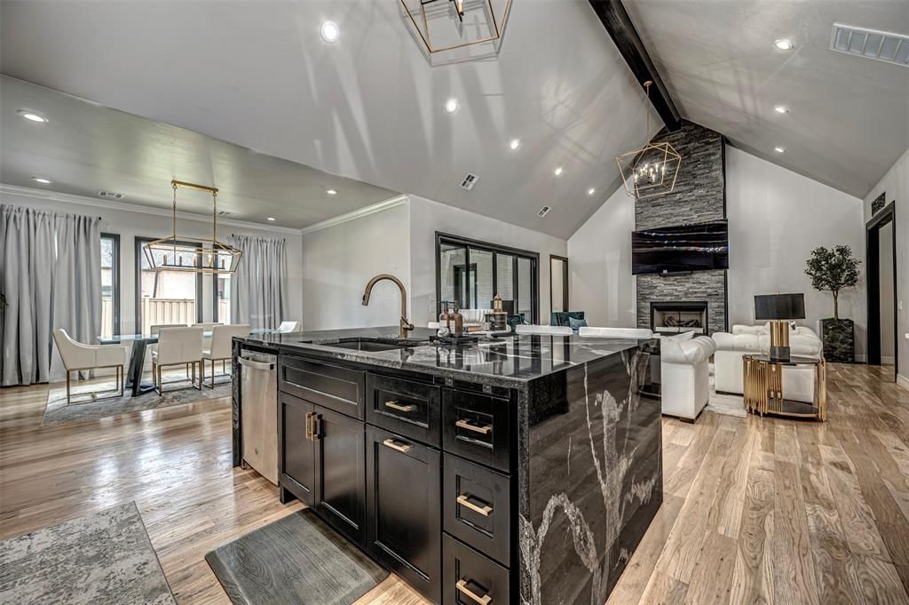 PRICE REDUCED! Stunning One-Level Transitional Home with Game Room & Designer Touches Throughout!This striking white brick 4-bedroom, 3-bathroom transitional home offers the perfect blend of luxury, function, and style all on a single level. From the moment you arrive, the painted brick exterior, sleek black roof with metal accents, and modern pivot front door make a bold impression. Step inside to a thoughtfully designed open layout where the living room, kitchen, dining area, and game room flow seamlessly together under soaring cathedral ceilings. The living room features a cozy fireplace with gas logs, while the nearby grand dining room is ideal for entertaining. The game room boasts custom floating cabinets, built-in bookshelves, and a designated TV space for ultimate relaxation or play. The chef's kitchen is a showstopper with a spacious walk-in pantry, generous counter space, and views that carry through the open-concept design. Retreat to the luxurious primary suite with dual walk-in closets, double vanity, a freestanding soaking tub, and an oversized walk-in shower. Enjoy outdoor living year-round on the covered patio, complete with a fireplace, ceiling fan, and motorized screen shade. The backyard is fully fenced with 6' vinyl privacy fencing and lush landscaping maintained by front and back sprinkler systems. Even the garage is upgraded with an epoxy-coated floor. This home checks all the boxes: style, space, and thoughtful design inside and out.