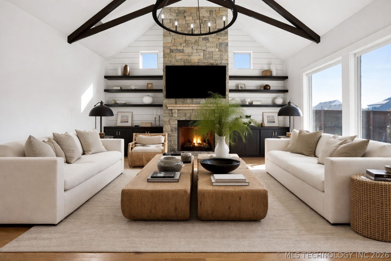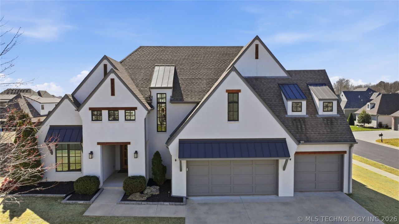 Located in the heart of Jenks on a corner lot in the gated neighborhood of Haddington Heights, within Jenks Schools. This full brick home offers incredible curb appeal with iron dormers and a flowing floor plan. Hardwood floors, vaulted ceilings with scissor truss beams, abundant natural light, electric shades, and a floor-to-ceiling stone fireplace highlight the main living space. The kitchen features quartz countertops, two-toned cabinetry, KitchenAid Pro Line appliances with double ovens and gas range, large walk-in pantry, and built-in dry bar with wine chiller. Primary suite and guest suite are downstairs. The primary retreat includes a spa-like bath and walk-in closet connected to the laundry room. A drop zone with built-in desks create a functional command center, home office or fantastic homework area. Upstairs offers a spacious game room, two bedrooms, each with walk-in closets, and a full bath. Enjoy the covered back patio with wood-burning fireplace and a large, fully fenced backyard with room for a pool. The three-car garage is complete with an in-ground storm shelter. Community amenities include a park, pond, and basketball court. Beautiful design, thoughtful layout, and a prime Jenks location.